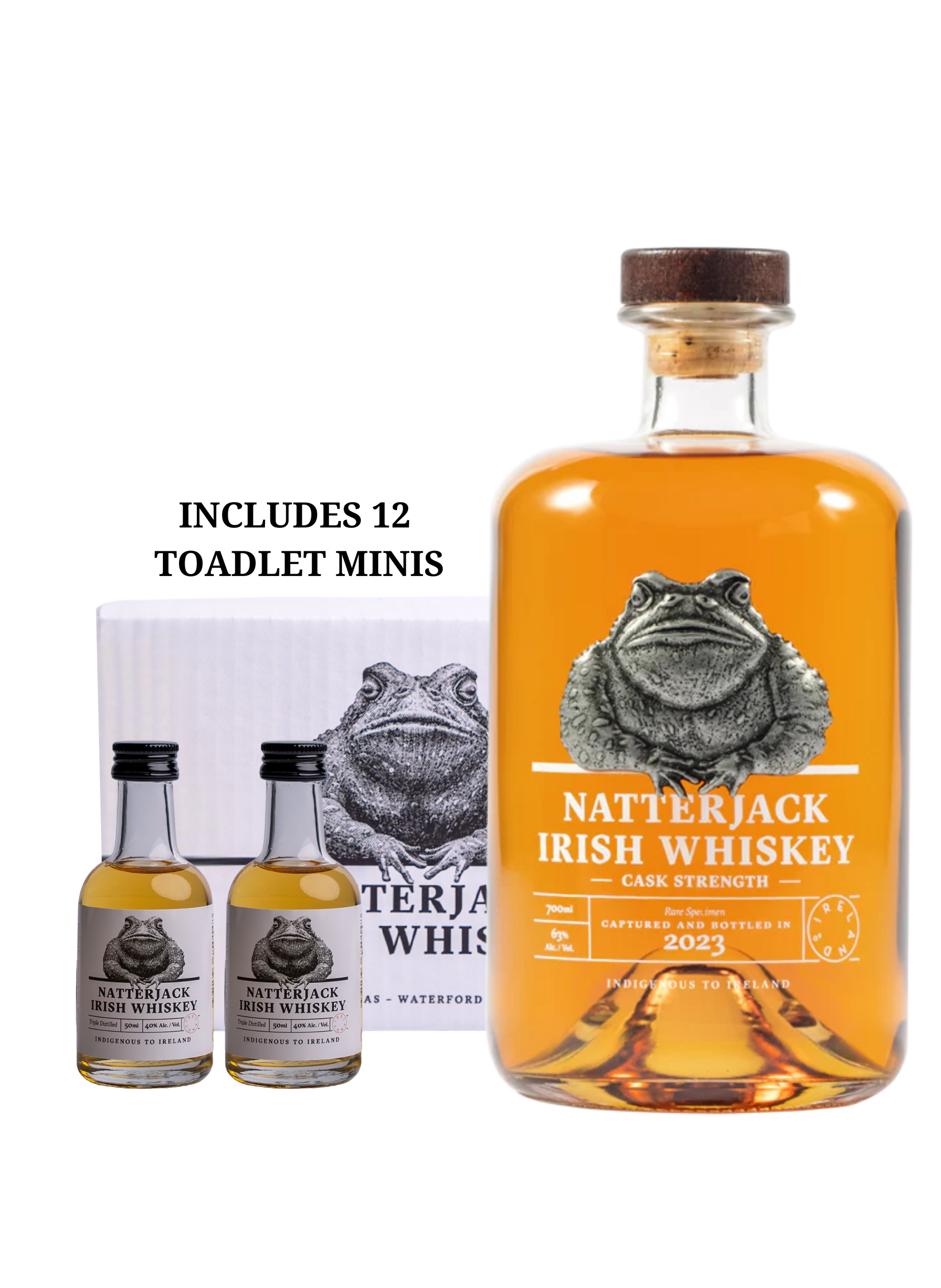 Accompanying this is the Natterjack Irish Whiskey Mini Toadlet Collection, a 12-pack of 50ml bottles, each capturing the essence of Natterjack in every drop. Perfect for enjoying on the go or sharing, these miniatures offer a taste of rich tradition and innovation in one exclusive package.